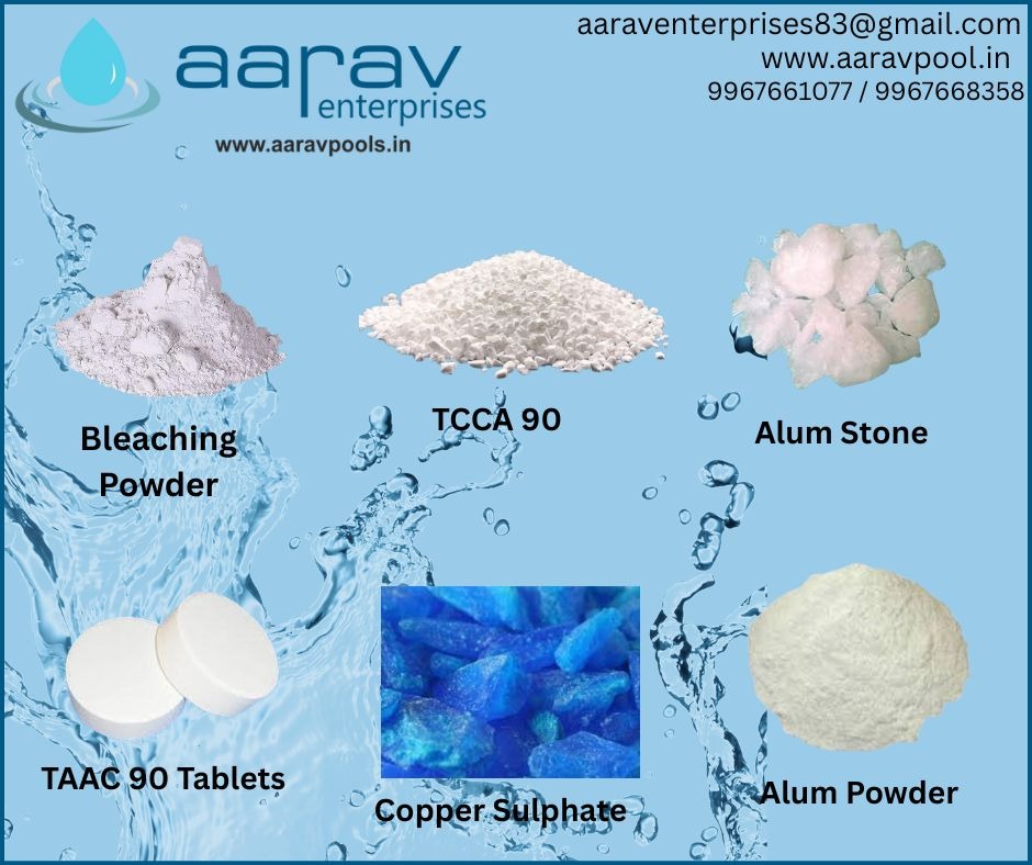 Swimming pool chemicals include sanitizers (like chlorine, bromine, or salt systems) to kill germs, pH adjusters (such as muriatic acid and soda ash) to balance acidity, and balancing chemicals like cyanuric acid for chlorine stabilization, calcium hardness increaser, and total alkalinity increaser to maintain water quality. Other types include shock treatments to kill contaminants, algaecides to prevent algae growth, clarifiers and flocculants to clump particles, and specialty chemicals for stain and scale removal or filter cleaning.
